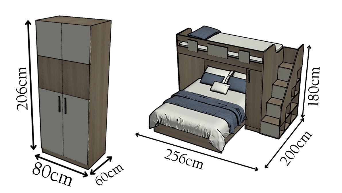 ° Bunk Bed Size: L: 256 cm – W: 200 cm – H : 180cm
