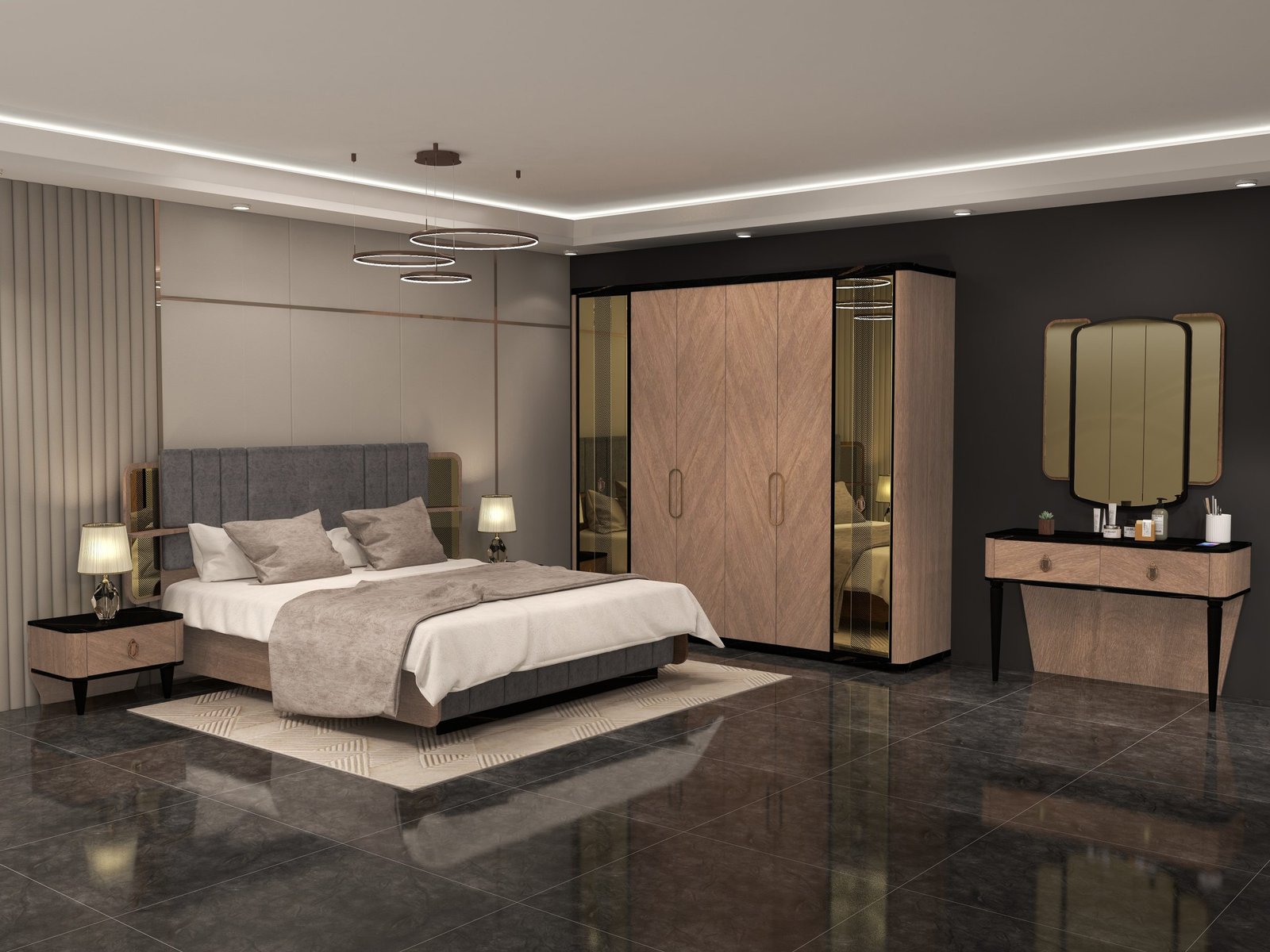 Transform your bedroom into a tranquil retreat with our Dream Bedroom Set. Crafted with clean lines and a focus on simplicity, this set brings a modern aesthetic to your personal space. The set includes a spacious bed frame, two nightstands, and a dresser, all designed to provide both style and functionality. Made with high-quality materials, this set promises durability and lasting beauty for years to come.