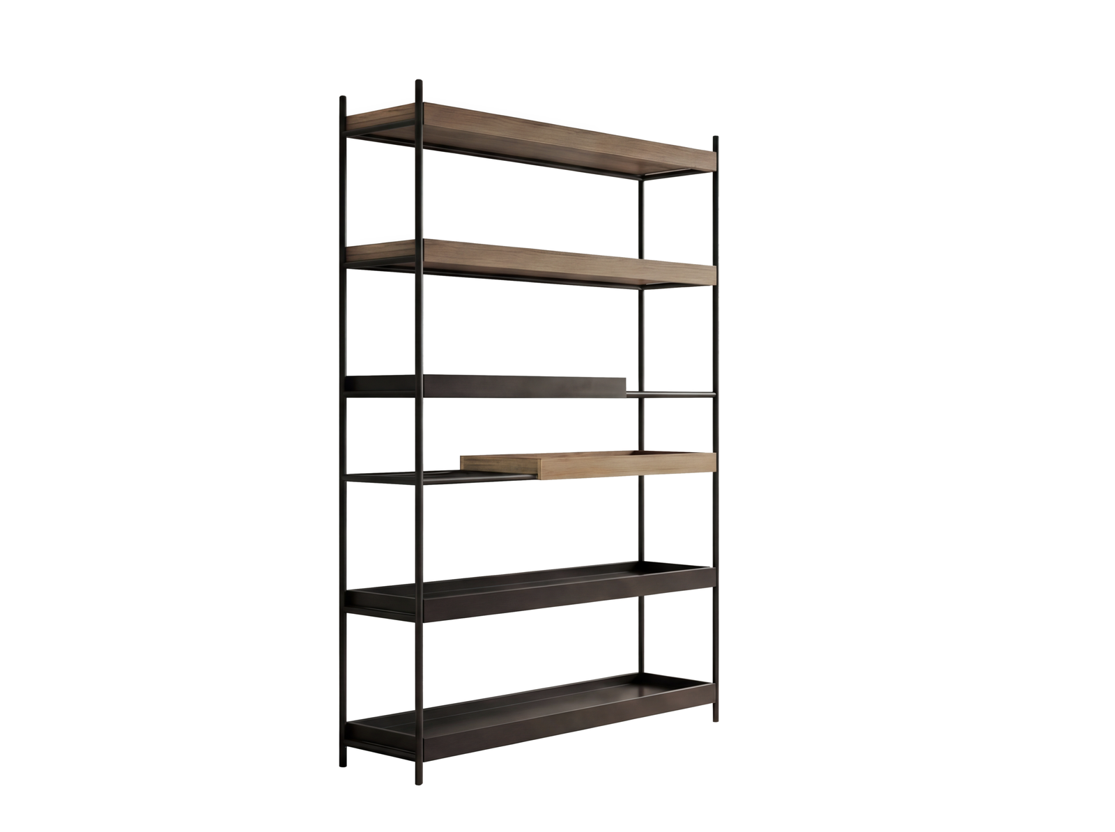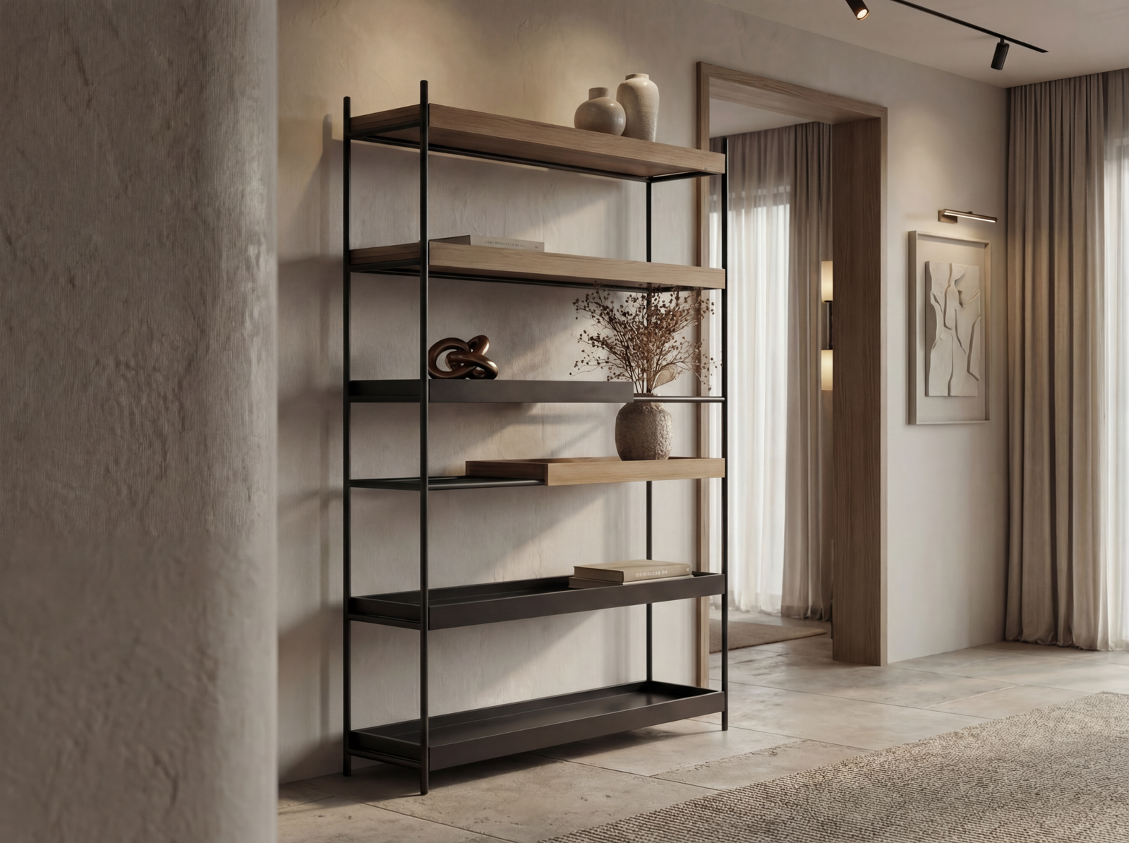 Seamlessly blend utility and style with this minimalist partition, featuring deep tray shelving and a matte black profile that whispers luxury through clean lines and impeccable material contrast.