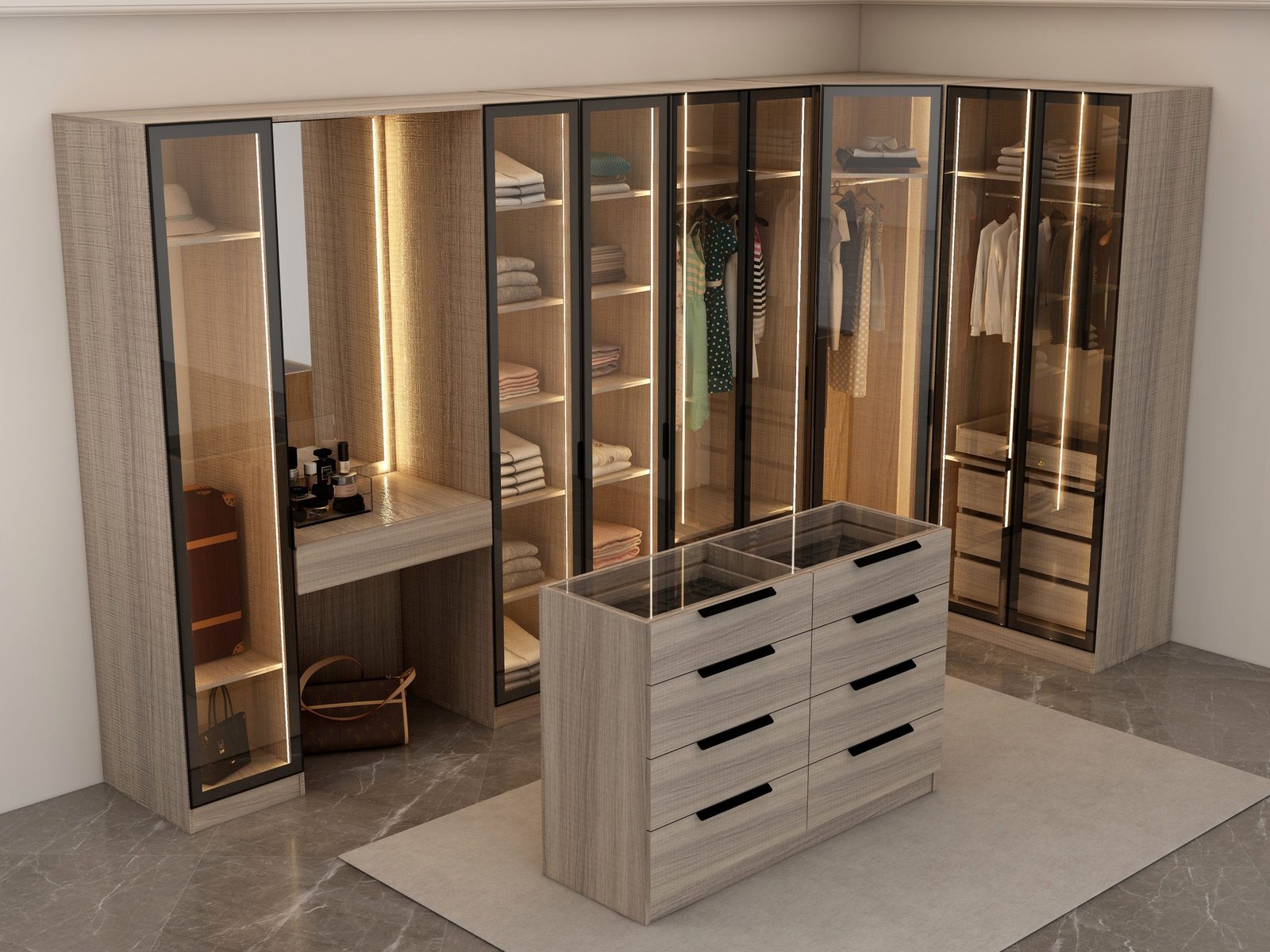 The Rotana Walk-In Closet: Modern minimalist design meets ultimate organization, transforming your dressing routine into a daily luxury.