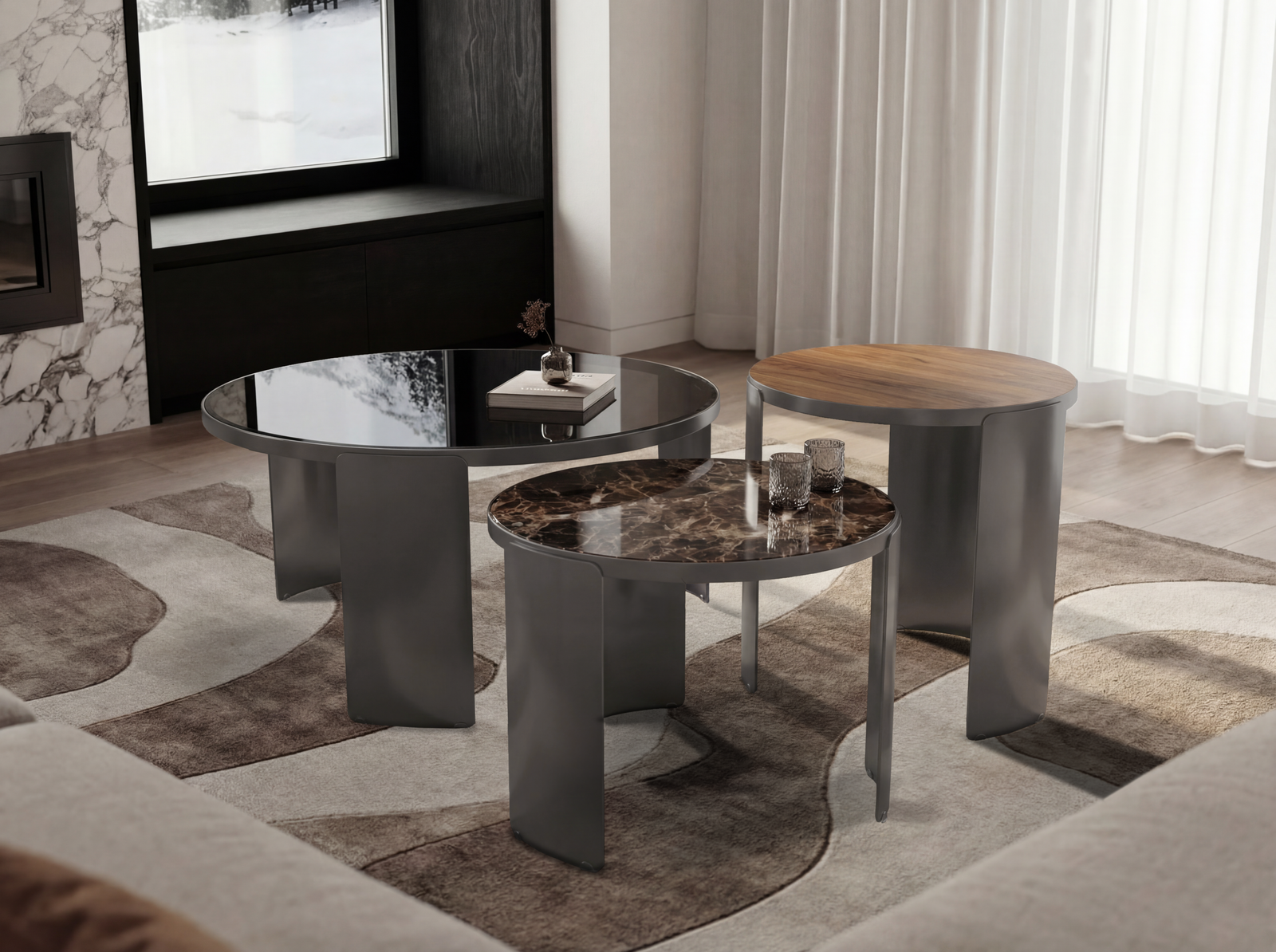 Elevate your living space with a dynamic, multi-tiered tablescapes that masterfully layers rich marble, warm wood, and reflective glass atop sweeping metallic curves for a truly sculptural centerpiece.
